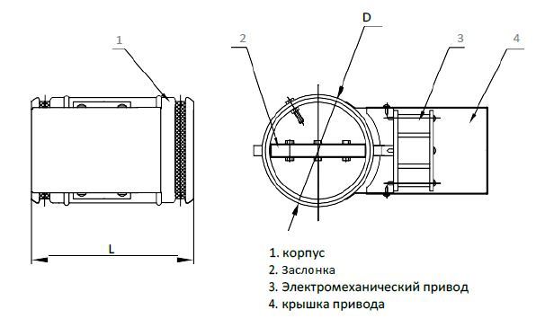 Клапан состоит из корпуса, изготовленного из оцинкованной стали толщиной 1 мм, огнеупорной заслонки из негорючих минеральных материалов и привода, расположенного снаружи или внутри корпуса.
